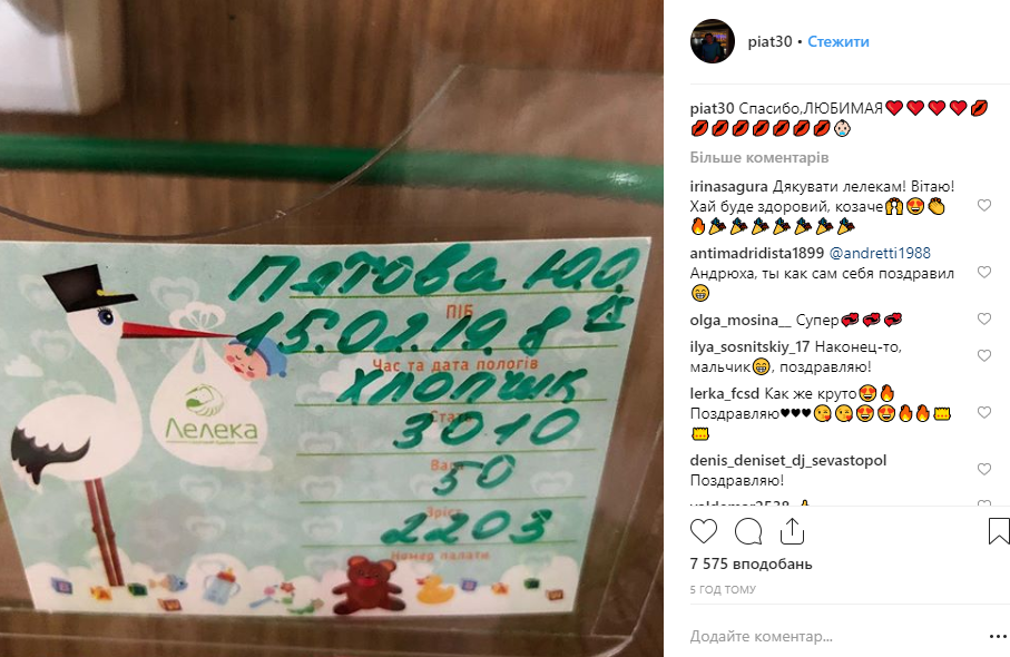 "Спасибо, любимая", – написал Андрей Пятов в Instagram и показал фотографию, на которой указаны указана дата рождения - 15.02.2019, пол ребенка - мальчик, рост - 50 см, вес - 3010 граммов.