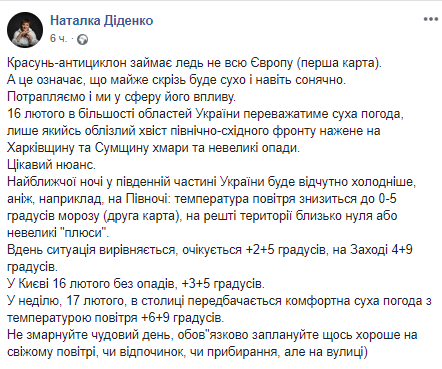 "16 февраля в большинстве областей Украины будет преобладать сухая погода, лишь какой-то облезлый хвост северо-восточного фронта нагонит в Харьковскую и Сумскую области облака и небольшие осадки. Интересный нюанс. Ближайшей ночью в южной части Украины будет ощутимо холоднее, чем, например, на Севере: температура воздуха снизится до 0-5 градусов мороза (вторая карта), на остальной территории около ноля или небольшие "плюсы", - обещает Наталья Диденко.
