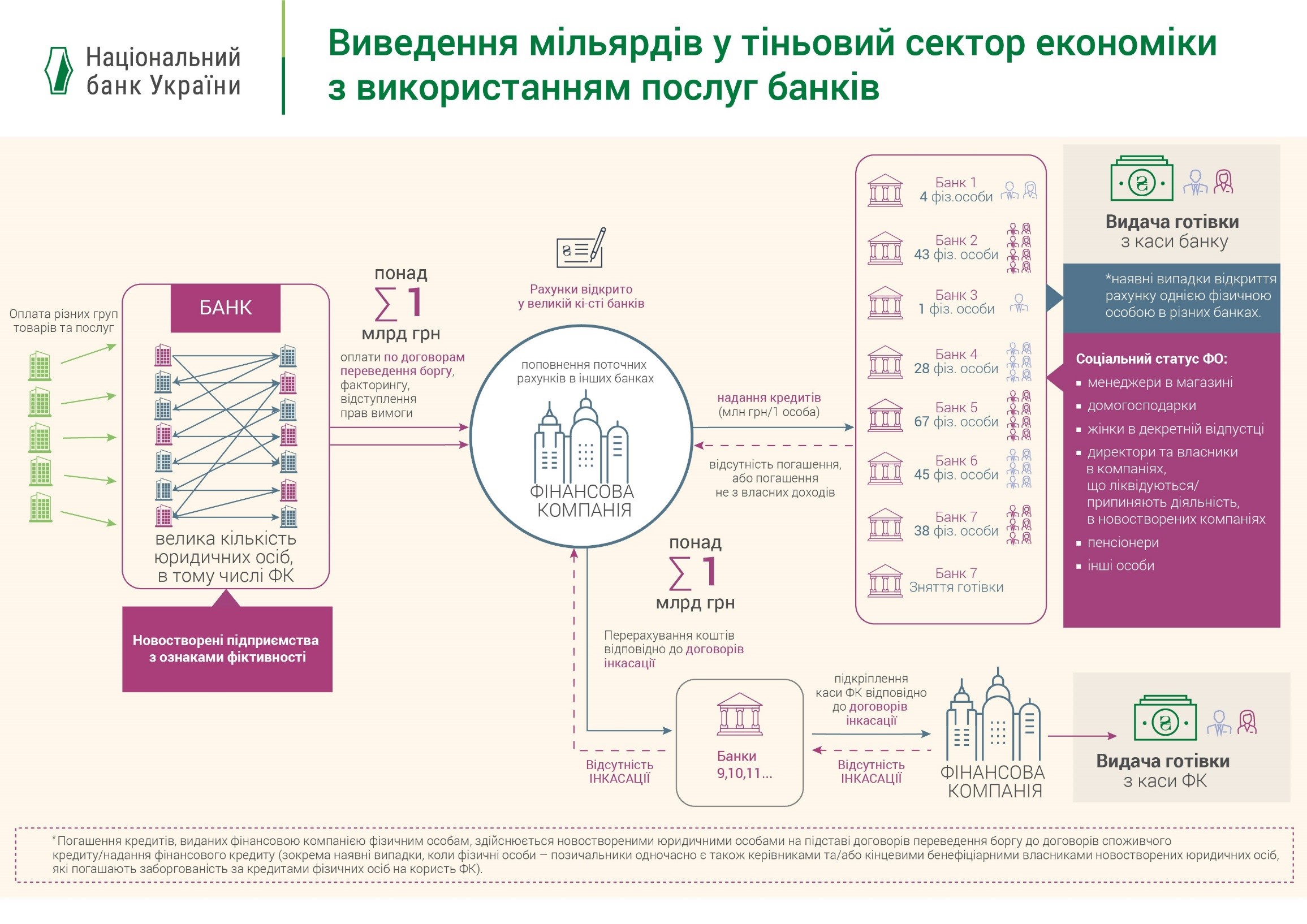 "Источниками происхождения средств, которые используются финкомпанией для выдачи кредитов физлицам, являются поступления от значительного количества вновь созданных юридических лиц. Вместе с этим, финансовая компания в отдельных случаях (прежде, чем перечислить средства физлицам), осуществляет пополнение собственного счета в другом банке, с которого фактически перечисляются средства на счета физлиц. На счетах юрлиц — контрагентов финкомпании аккумулируются средства от большого количества других юрлиц, поступающих с различным назначением. В том числе в качестве оплаты за различные группы товаров и услуг. При этом средства, которые использовались финансовой компанией для выдачи кредитов физическим лицам и средства, которые использовались юрлицами для оплаты задолженности по кредитам физлиц, фактически поступали с одних и тех же источников", — говорится в документе НБУ.