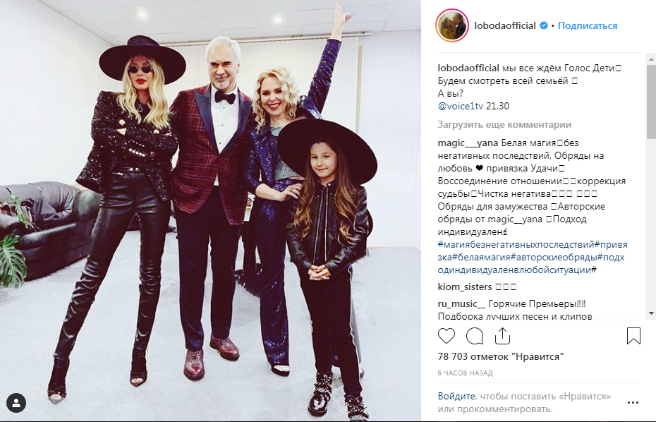 Украинская певица Светлана Лобода выложила в своем Instagram фото из закулисья российского шоу "Голос. Дети". На нем она позирует в шляпе и очках в компании Валерия Меладзе и Пелагеи, а также своей дочери Евы.