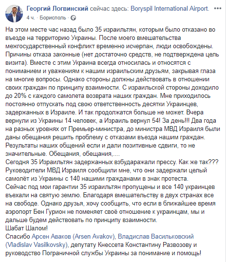 По словам депутата, в настоящее время граждане с обеих сторон освобождены и пропущены в страну назначения, однако межгосударственный конфликт длится не первый день. По словам Логвинского, до 20% украинцам в Израиле отказывают во въезде.