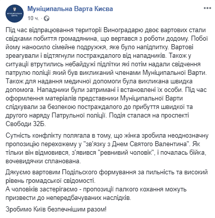 Инцидент произошел на проспекте Свободы 32-б. Мужчина возвращался с работы домой, он проходил мимо женщины, которая "в связи с Днем Святого Валентина" сделала ему "неоднозначное предложение". Прохожий ей отказал, но в этот момент появился "ревнивый муж", который спровоцировал драку. В сообщении сказано, что избиение, очевидно, было спланировано заранее.