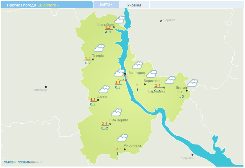 Похожая температура будет и в центральных регионах, однако ночами температура будет держаться на отметке -1+1 градусов. Погода будет пасмурной. На юге страны прогнозируется тепло в районе +4+6 градусов, ночами похолодает минимум до -3. В северных областях также будет пасмурно. Температура днем +3+5, ночью 0-2. В Киеве сегодня будет пасмурно, но без осадков. Температура днем +3+5, ночью около ноля.