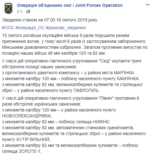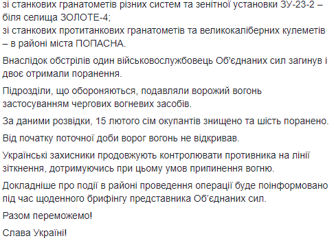 "15 февраля российские оккупационные войска 9 раз нарушили режим прекращения огня, в том числе 6 раз с применением запрещенного Минскими договоренностями вооружения. В общем противник выпустил по позициям наших войск 48 мин калибров 120 и 82 мм. Вследствие обстрелов один военнослужащий Объединенных сил погиб и двое получили ранения", - сказано в сообщении.