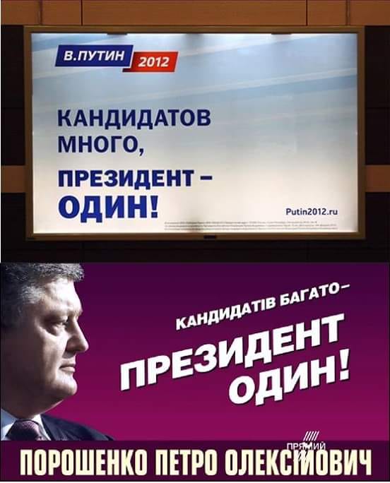 Накануне выборов в РФ в 2012 году пиарщики Владимира Путина разместили билборд со слоганом: "В. Путин 2012. Кандидатов много, президент - один!". В то же время накануне выборов президента Украины в марте 2019 года по телеканалу "Прямой" показали рекламу со слоганом: "Кандидатов много - президент один! Порошенко Петр Алексеевич".