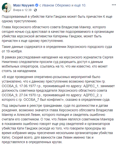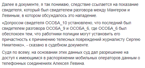 "В рамках расследования нападения на херсонского журналиста Сергея Никитенко следователи просили суд разрешить доступ к данным мобильных операторов, ссылаясь на то, что им известно, кто может стоять за нападением... Под закрытыми в реестре гражданами, судя по должностям и датам рождения, возможно, значатся... Мангер и Алексей Левин, которого полиция и свидетель ошибочно считали его советником", – написал юрист, ссылаясь на определение Херсонского городского суда от 19 ноября 2018 года.