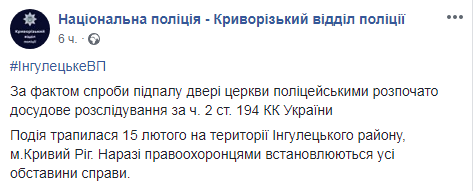 Полиция Кривого Рога по факту попытки поджога церкви начала досудебное расследование по ч. 2 ст. 194 Уголовного кодекса (умышленное уничтожение или повреждение имущества).