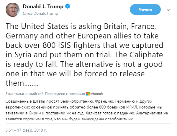 Трамп также отметил, что не хочет наблюдать за тем, как террористы проникают в европейские страны. "США призывают Британию, Францию, Германию и других европейских союзников взять обратно более 800 боевиков ИГ, захваченных в Сирии, и предать их суду", – сказал он.