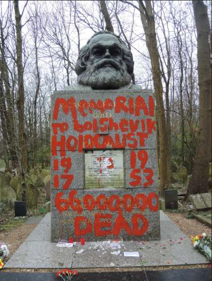 Вандалы нанесли красной краской надписи на надгробный памятнике идеолога коммунизма. "Мемориал большевистского Холокоста 1917-1953, 66 миллионов жертв", "Доктрина ненависти", "Идеология голода", "Архитектор геноцида, террора, репрессий и массовых убийств", - говорится в посланиях.
