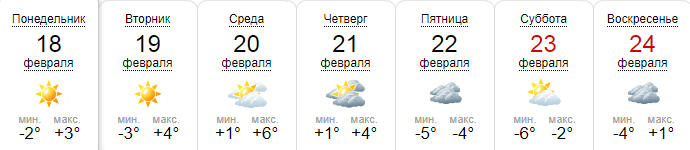 Сайт Weather.com сообщает, что первые три дня недели будут солнечными и теплыми до +5...+7. В четверг небо затянут тучи и станет чуть прохладнее: до +3 днем. А в пятницу и субботу обещают морозный всплеск. Днем температура опустится до -2...-4. Однако уже в воскресенье воздух прогреется до +2 днем.