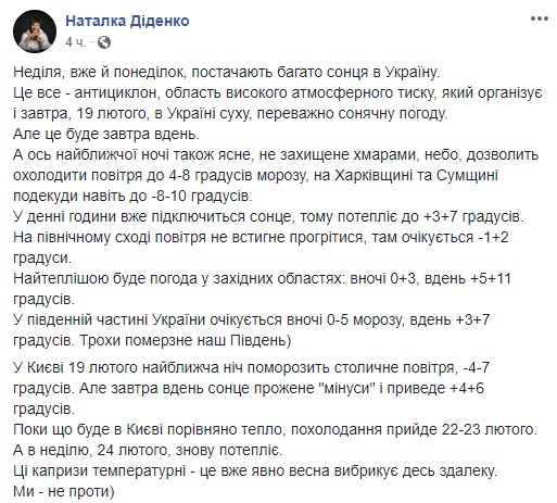 По данным синоптика Opogode Натальи Диденко, солнечная и тепла погода в Киеве установилась благодаря области высокого атмосферного давления (при этом ночи будут морозными). Однако антициклон сменится похолоданием 22-23 февраля. Но уже 24 февраля вновь потеплеет.