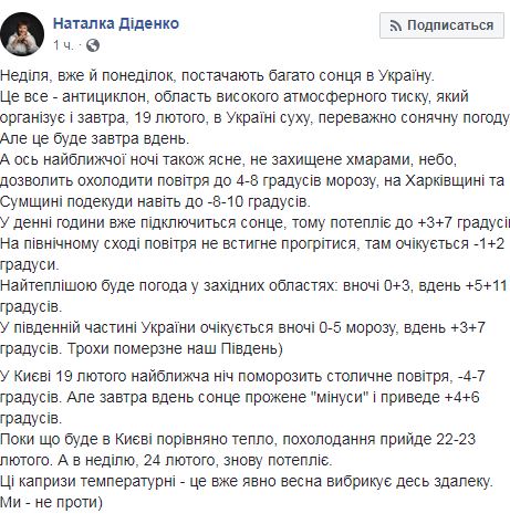 "В Киеве 19 февраля ближайшая ночь поморозит столичный воздух, -4...-7 градусов. Но днем солнце прогонит "минусы" и приведет к +4...+6 градусам", - сообщает синоптик.