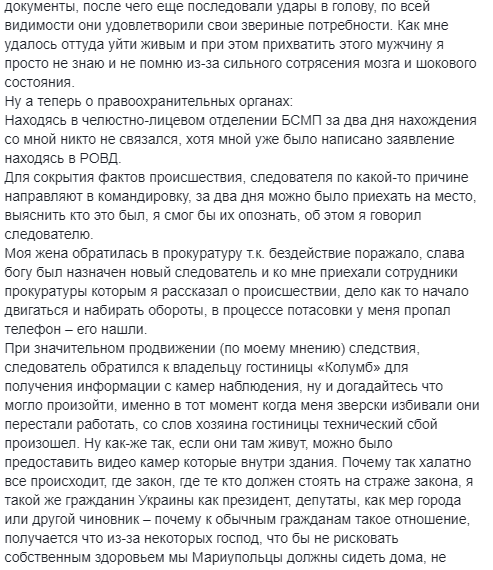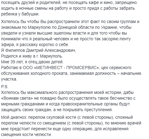 Парня начали избивать и требовать, чтобы он предъявил свои документы. Но увидев, что перед ними - житель Мариуполя, военные не успокаивались. "Я наблюдал, как рядом избивают ногами мужчину лет 50-55, который лежал на земле, чудом мне удалось забрать свои документы, после чего еще последовали удары в голову, по всей видимости, они удовлетворили свои звериные потребности. Как мне удалось оттуда уйти живым и при этом прихватить этого мужчину я просто не знаю и не помню из-за сильного сотрясения мозга и шокового состояния", - пишет Филиппов.
