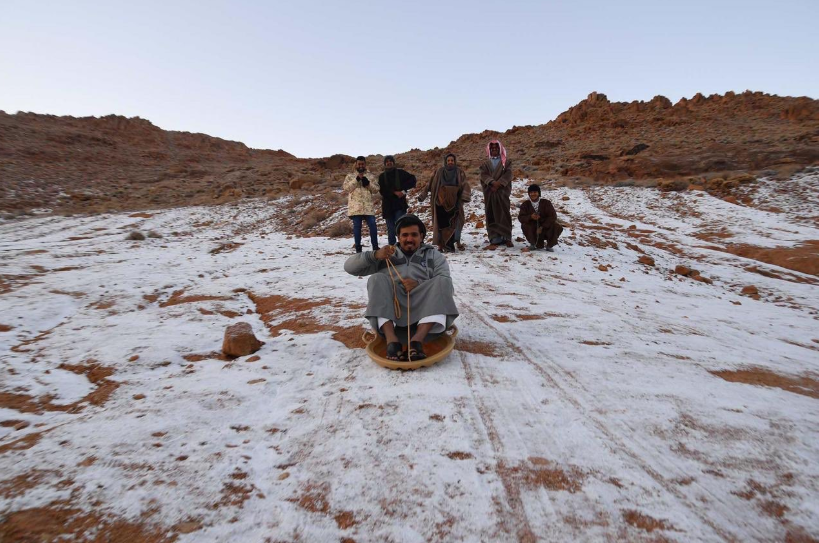 На фотографиях в соцсетях видно, как бедуины в традиционных длинных рубахах (галабеях), укутавшись в головной платок (куфия), скатываются по склонам на самодельных "ледянках" и даже устраивают соревнования.