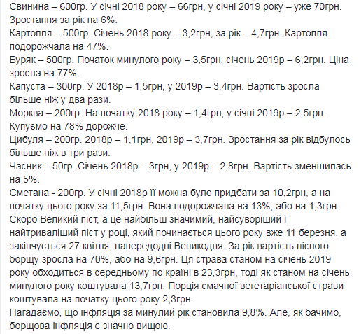 "Чтобы приготовить борщ понадобится 600 граммов свинины, по 500 граммов картофеля и свеклы, 300 граммов капусты, по 200 граммов моркови и лука, вода, лавровый лист, соль, черный перец, сметана, чеснок. В январе 2018-го за необходимое количество свинины платили 66 гривен, 2019-го - 70 гривен, свидетельствуют данные Госкомстата. Свинина подорожала на 6% ", - отмечается на Фейсбук-странице Дорошенко.