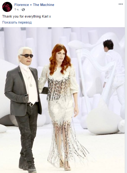 Вокалистка британской группы "Florence and the MachineЙ" Флоренс Уэлч написала: "Спасибо тебе за все, Карл".