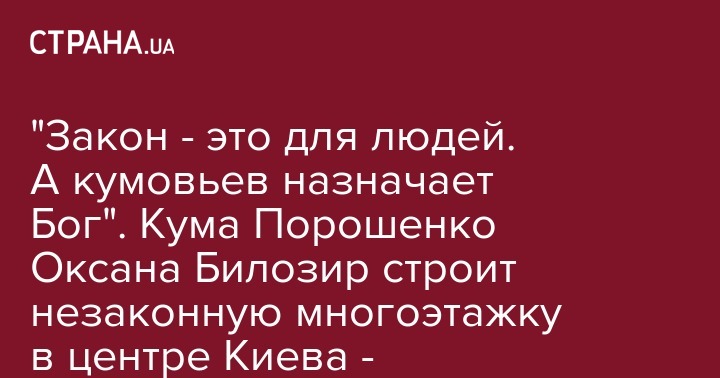 "Кума Ющенко Оксана Билозир получила землю на Подоле под дачу. Кума Порошенко Оксана Билозир начала возводить на этой земле вместо дачи 9-этажный дом. Шесть этажей уже есть. Без всяких разрешений. Будущее этого самостроя зависит конечно, не от закона, а от того, будет ли какой-то ее кум следующим президентом. Потому что закон - это для людей. А кумовьев - назначает Бог", - пишет на своей странице в Facebook журналист Олекса Шалайский.