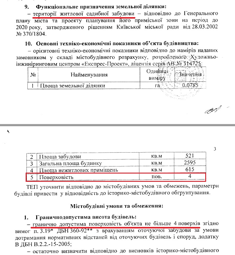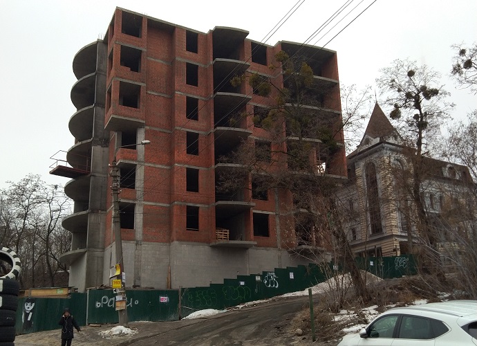 По Генплану земельный участок по указанному адресу относится к территории жилой усадебной застройки, что означает, что на нем могут располагаться частные дома не выше 3-4 этажей. Департамент градостроительства и архитектуры КГГА в декабре 2016 года согласовал возведение такого здания. На сегодняшний день, в доме, который строится на участке, уже шесть этажей. Всего запланировано возвести девять.
