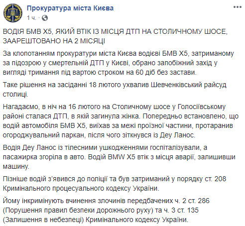 "По ходатайству прокуратуры города Киева водителю BMW Х5, задержанному по подозрению в смертельном ДТП в Киеве, избрана мера пресечения в виде содержания под стражей сроком на 60 суток без залога", - сказано в сообщении.