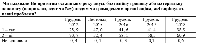 Отмечается, что уровень вовлеченности в благотворительную деятельность пока остается выше, чем до Евромайдана. В частности, в течение 2018 большую благотворительную помощь оказывали жители запада (58%) и центра (41%) и меньше - юга (23%) и востока (24%). Опрос проводился с 19 по 25 декабря 2018 во всех регионах Украины за исключением Крыма и оккупированных территорий Донецкой и Луганской областей. Для исследования были опрошены 2017 респондентов в возрасте от 18 лет. Теоретическая погрешность выборки не превышает 2,3%.