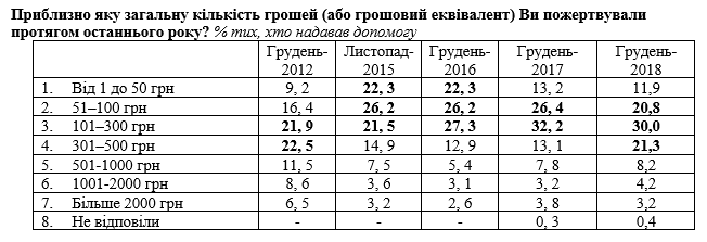 "Общая сумма, которую благотворители жертвовали в течение 2018 года, несколько возросла по сравнению с предыдущими годами", - говорится в выводах опроса. В частности, в 2017 году основная сумма пожертвований приходилась на суммы от 50 до 300 гривен, а в 2018 году - от 50 до 500 гривен.