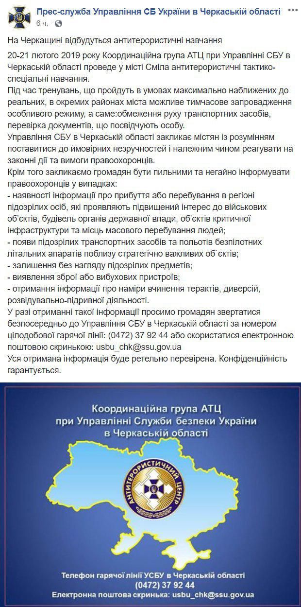 Сегодня стало известно, что 20-21 февраля Координационная группа АТЦ при Управлении СБУ в Черкасской области будет проводить в Смеле антитеррористические тактико-специальные учения.