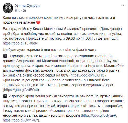 В Киево-Могилянской академии проводят День донора, чтобы собрать неравнодушных людей и поделиться частичкой жизни со всеми, кто нуждается. Она пригласила потенциальных доноров 21 февраля, с 09:00 по 14:00 и опубликовала ссылку на мероприятие.