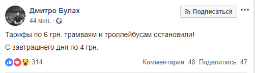 "Тарифы по 6 грн. трамваям и троллейбусам остановили! С завтрашнего дня по 4 грн", — написал он.