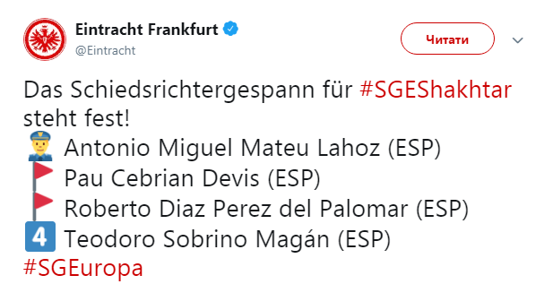 В УЕФА назначили бригаду арбитров на ответную игру 1/16 Лиги Европы между Айнтрахтом и Шахтером во Франкфурте. Встречу команд обслужит испанская бригада арбитров во главе с Матеу Лаосом. Об этом сообщили в твиттере Айнтрахта.