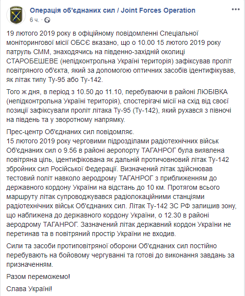 "В сети Интернет, некоторыми информационными Интернет-изданиями распространяется информация, что якобы 15 февраля 2019 в воздушном пространстве Украины в районе проведения ООС наблюдался пролет самолет Воздушно-космических сил РФ типа ТУ-95. Проверив выше указанную информацию сообщаем, что она не соответствует действительности и является фейковой", - сказано в сообщении ВС ВСУ на странице в соцсети Фейсбук во вторник.