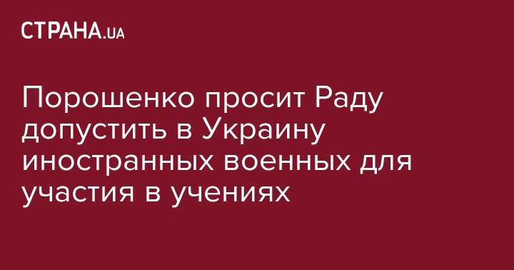 Президент Украины Петр Порошенко предложил Верховной Раде разрешить допуск в страну иностранных военных для участия в многонациональных учениях в 2019 году. Об этом говорится в законопроекте №10067, зарегистрированном в аппарате парламента. Документ помечен как неотложный.