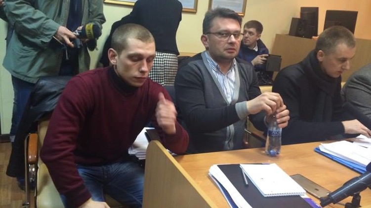Лейтенант Сергей Олейник в суде (слева в бордовом свитере)