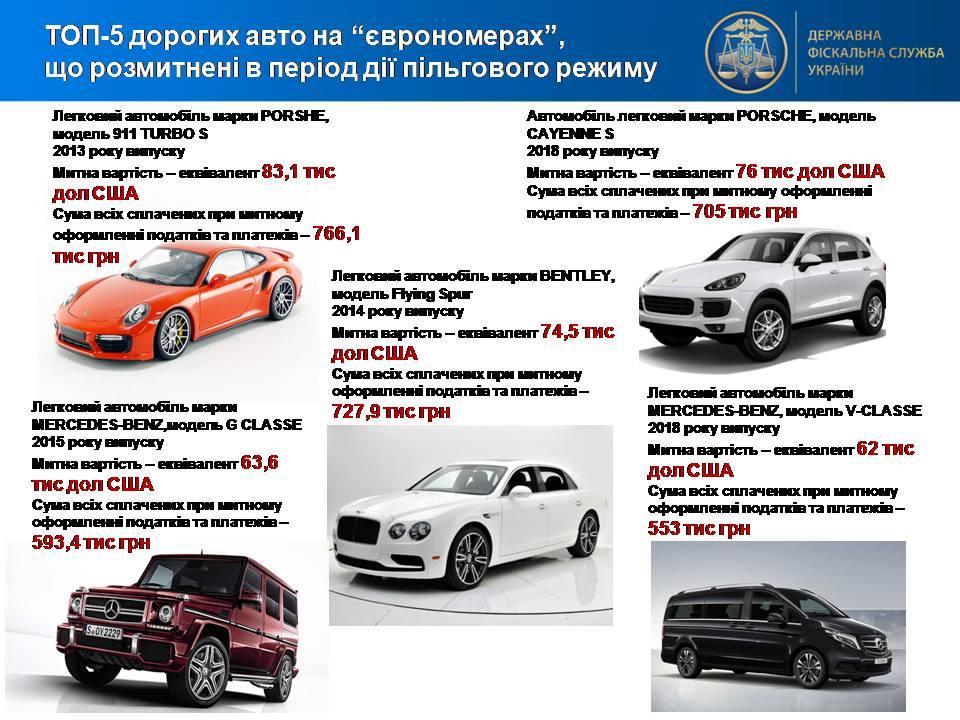 В Государственной фискальной службе назвали пять самых дорогих автомобилей, которые были растаможены в течение льготного периода. Среди них два автомобиля марки Porshe, два Mercedes-Benz и один Bentley. Об этом сообщает пресс-служба ГФС.