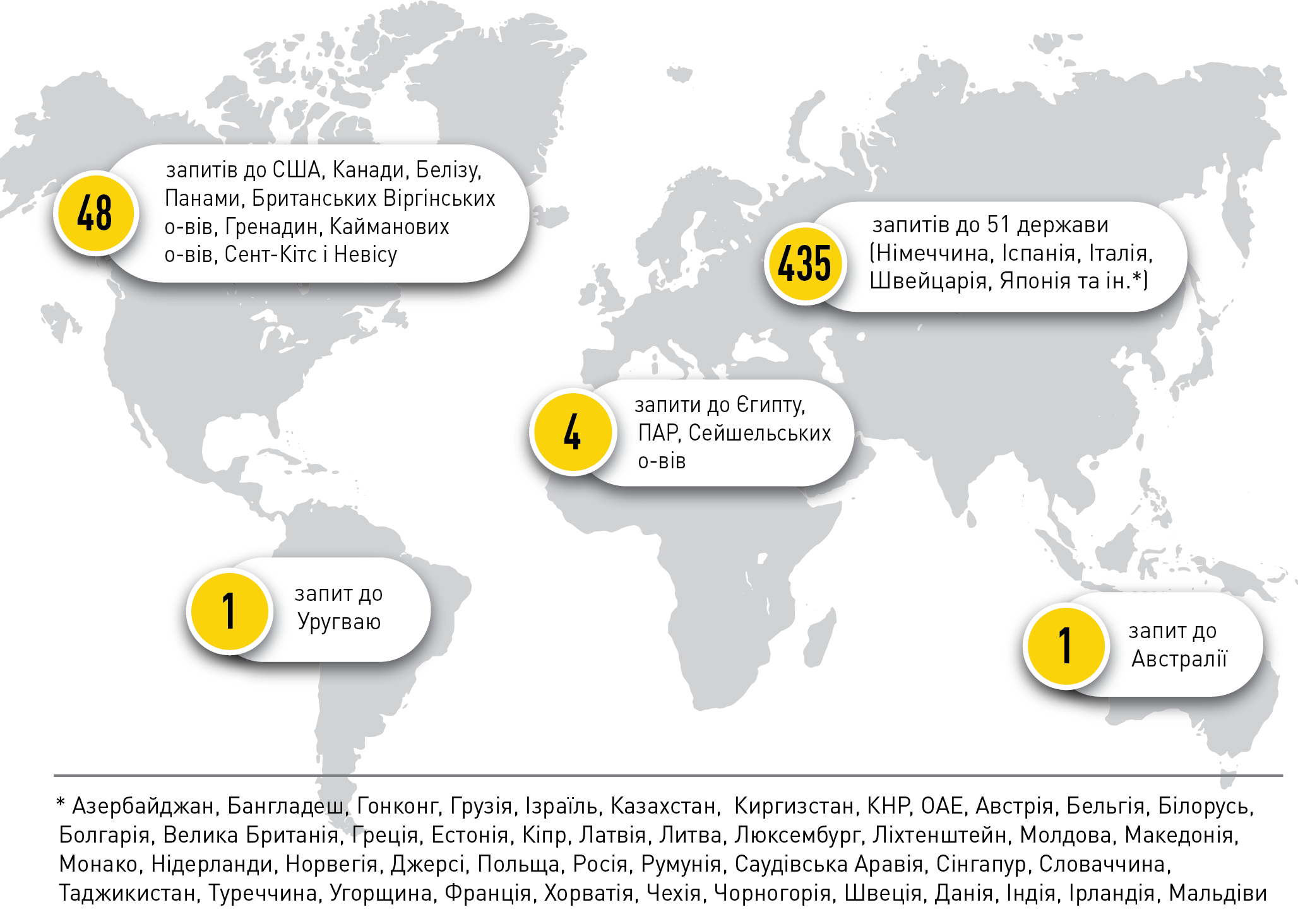 По данным бюро, чаще всего детективам приходится обращаться за помощью к правоохранителям Латвии, Кипра, Великобритании, Германии и Швейцарии. Это связано с тем, что большинство коррупционных схем, прежде всего связанных с деятельностью государственных предприятий и реализацией национальных проектов, предполагает участие компаний, зарегистрированных за рубежом.