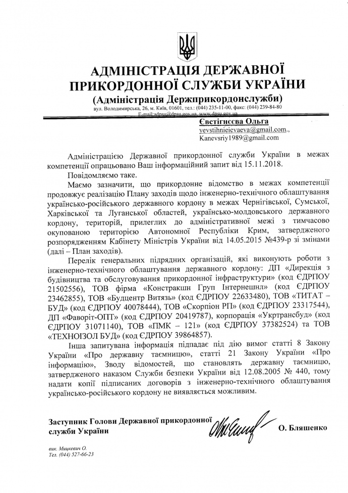 В ноябре 2018 года, по данным Госпогранслужбы, 9 компаний строили "Стену": кроме упомянутого ООО "Стройцентр Витязь", это ГП "Дирекция по строительству и обслуживанию пограничной инфраструктуры", ООО "ТИТАН-СТРОЙ", ООО "Скорпион РП", корпорация "Укртрансбуд", ООО "ПМК-121", ООО "Техноизол БУД", ООО Фирма "Констракшн Груп Интернэшнл", которая находится в официальном "черном списке" Антимонопольного комитета из-за нарушений на тендерах, и ГП "Фаворит-ОПТ", которое принадлежит семье народного депутата Борислава Розенблата.