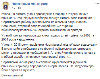Украинский боец из Тернопольской области Василий Богоносюк погиб от пули снайпера на Донбассе в среду, 20 февраля. Об этом сообщается на странице Чортковского горсовета в соцсети Facebook.