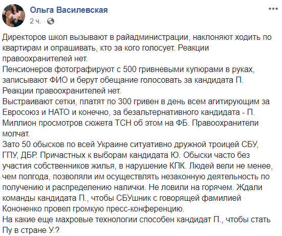 Журналистка Ольга Василевская удивляется, почему СБУ закрывает глаза на явный подкуп избирателей со стороны Порошенко.