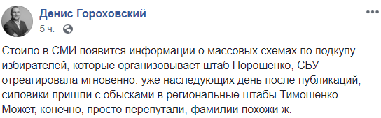"Стоило в СМИ появиться информации о массовых схемах по подкупу избирателей, которые организовывает штаб Порошенко, СБУ отреагировала мгновенно: уже на следующий день после публикаций силовики пришли с обысками в региональные штабы Тимошенко.