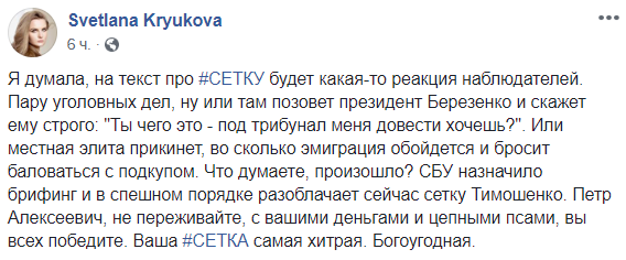 "Я думала, на текст про #СЕТКУ будет какая-то реакция наблюдателей. Пару уголовных дел, ну или там позовет президент Березенко и скажет ему строго: "Ты чего это – под трибунал меня довести хочешь?". Или местная элита прикинет, во сколько эмиграция обойдется, и бросит баловаться с подкупом. Что, думаете, произошло? СБУ назначила брифинг и в спешном порядке разоблачает сейчас Сетку Тимошенко. Петр Алексеевич, не переживайте, с вашими деньгами и цепными псами вы всех победите. Ваша #СЕТКА – самая хитрая. Богоугодная".