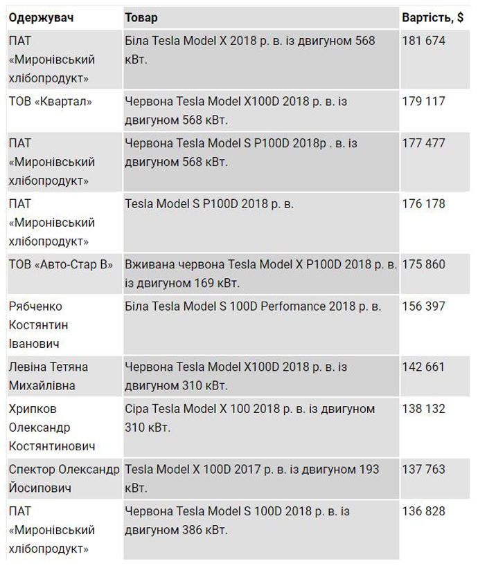 В 2018 году владелец агрохолдинга "Мироновский хлебопродукт" и миллиардер Юрий Косюк, который состоит в дружеских отношениях с президентом Петром Порошенко, получая от него дотации, приобрел и ввез в Украину четыре электрокара Tesla, стоимость которых составила 672 тысячи долларов. Об этом в пятницу, 22 февраля, сообщают "Наші гроші".