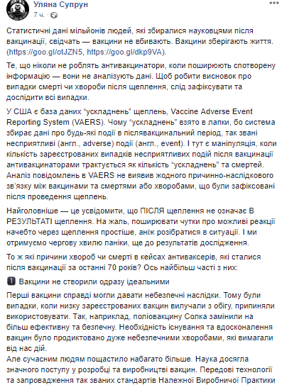 "Статистические данные миллионов людей, которые собирались учеными после вакцинации, свидетельствуют - вакцины не убивают. Вакцины сохраняют жизнь. То, что никогда не делают антивакцинаторы, когда распространяют искаженную информацию - они не анализируют данные. Чтобы судить о случаях смерти или болезни после прививки, следует зафиксировать и исследовать все случаи", - написала Ульяна Супрун.
