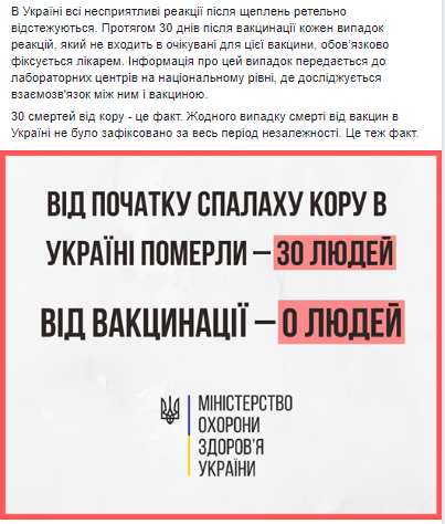 В Украине с момента вспышки кори от этой болезни умерло 30 человек, при этом ни один украинец не умер от прививок с момента провозглашения независимости. Об этом на своей странице в Facebook написала глава Минздрава Ульяна Супрун.
