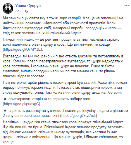 Чтобы питаться здорово, необходимо обращать внимание не только на калорийность продуктов, но и на их гликемический индекс, который влияет на скорость поднятия уровня сахара в крови. Об этом на своей странице в Facebook написала глава Минздрава Ульяна Супрун.