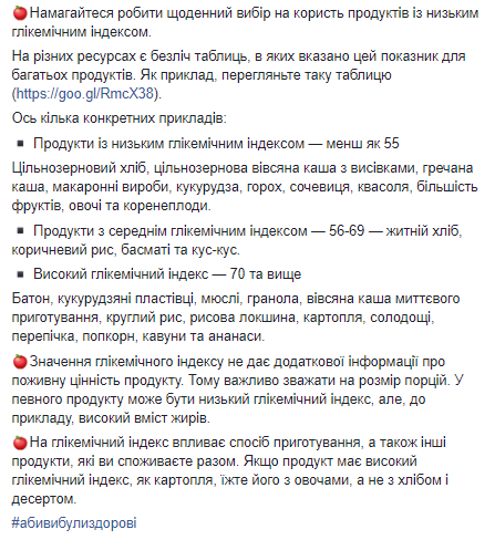 Кроме того, глава Минздрава перечислила продукты с низким гликемическим индексом: цельнозерновой хлеб, цельнозерновая овсяная каша с отрубями, гречневая каша, макаронные изделия, кукуруза, горох, чечевица, фасоль, большинство фруктов, овощи и корнеплоды. Со средним гликемическим индексом: ржаной хлеб, коричневый рис, басмати и кус-кус. С высоким: батон, кукурузные хлопья, мюсли, гранола, овсяная каша моментального приготовления, круглый рис, рисовая лапша, картофель, сладости, лепешка, попкорн, арбузы и ананасы.