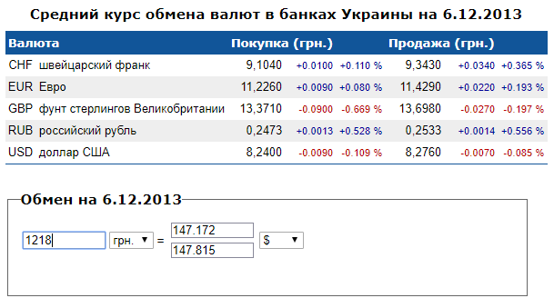 По данным Минфина, в 2013 году размер минимальной зарплаты в Украины с 1 декабря устанавливался в размере 1218 гривен, что в переводе по курсу валют, действовавшему тогда, соразмерен 147 долларам.