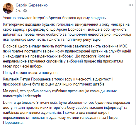 Нардеп от БПП Сергей Березенко, которого Арсен Аваков назвал одним из организаторов процесса скупки голосов штабом Порошенко, отреагировал на слова главы МВД. Свое заявление он опубликовал на странице в Facebook.