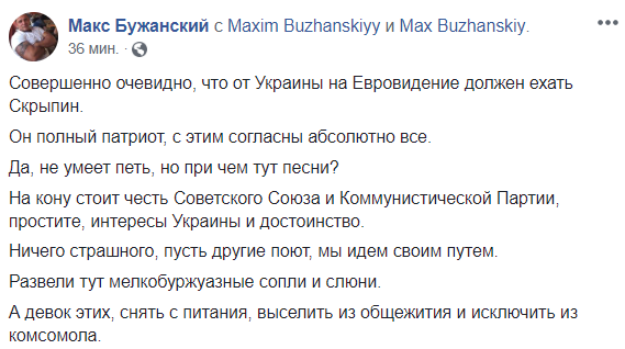 "Совершенно очевидно, что от Украины на Евровидение должен ехать Скрыпин. Он полный патриот, с этим согласны абсолютно все.