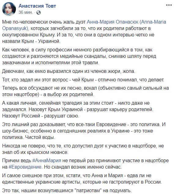 "Мне по-человечески очень жаль дуэт Анна-Мария Опанасюк (Anna-Maria Opanasyuk), которых загнобили за то, что их родители работают в оккупированном Крыму. И за то, что они в одном интервью четко не назвали Крым – Украиной.