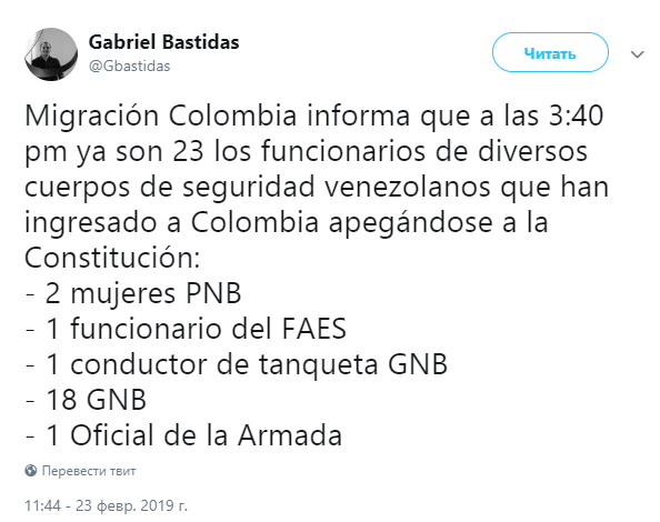 "Колумбийское миграционное управление сообщает, что к 15:40 (21:40 по Киеву) 23 представителя различных органов безопасности Венесуэлы оказались в Колумбии, заявив о верности конституции Венесуэлы. Речь идет о двух женщинах-полицейских, одном спецназовце, одном водителе бронеавтомобиля, 18 бойцах Национальной гвардии и одном офицере ВМС", - написал он.