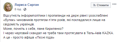 "Отсутствие информполитики и пропаганды на госуровне и расслабленные "булки" чиновников в течение пяти лет, полагались только на сознание украинцев. Может, начнете с себя, господин Кириленко? И через очередной скандал не надо же протягивать в Тель-Авив группу Kazka.